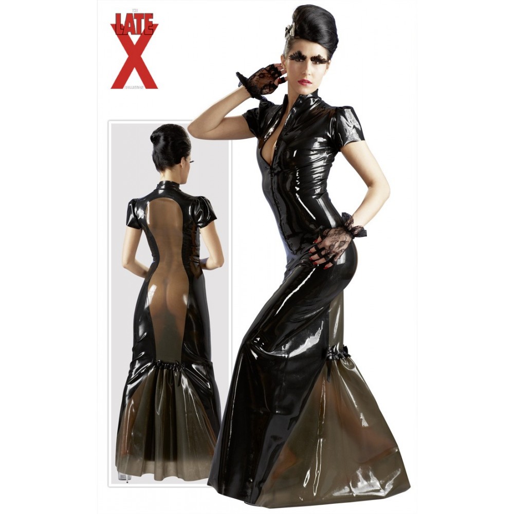 Abito lungo in lattice con trasparenze, fornisce a chi lo indossa una silhouette a clessidra. Dispone di una cerniera sulla parte anteriore e la trasparenza nera fumè, sulla parte posteriore. Le maniche sono corte disponibile in tutte le taglie. .