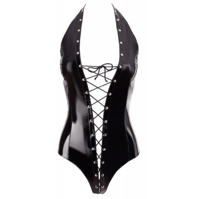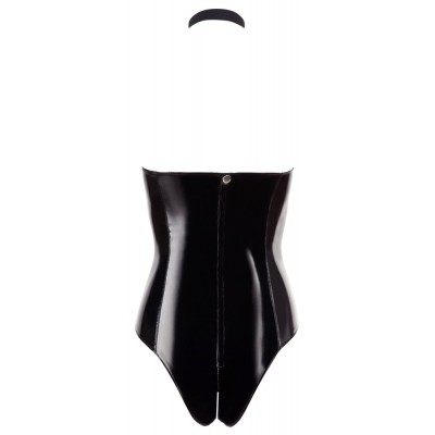 Body in vinile nero con scollo all'americana e allacciatura fantasia sul davanti che arriva fino al cavallo aperto. Con cerniera e bottone automatico sul retro. 100% poliestere con rivestimento in poliuretano.