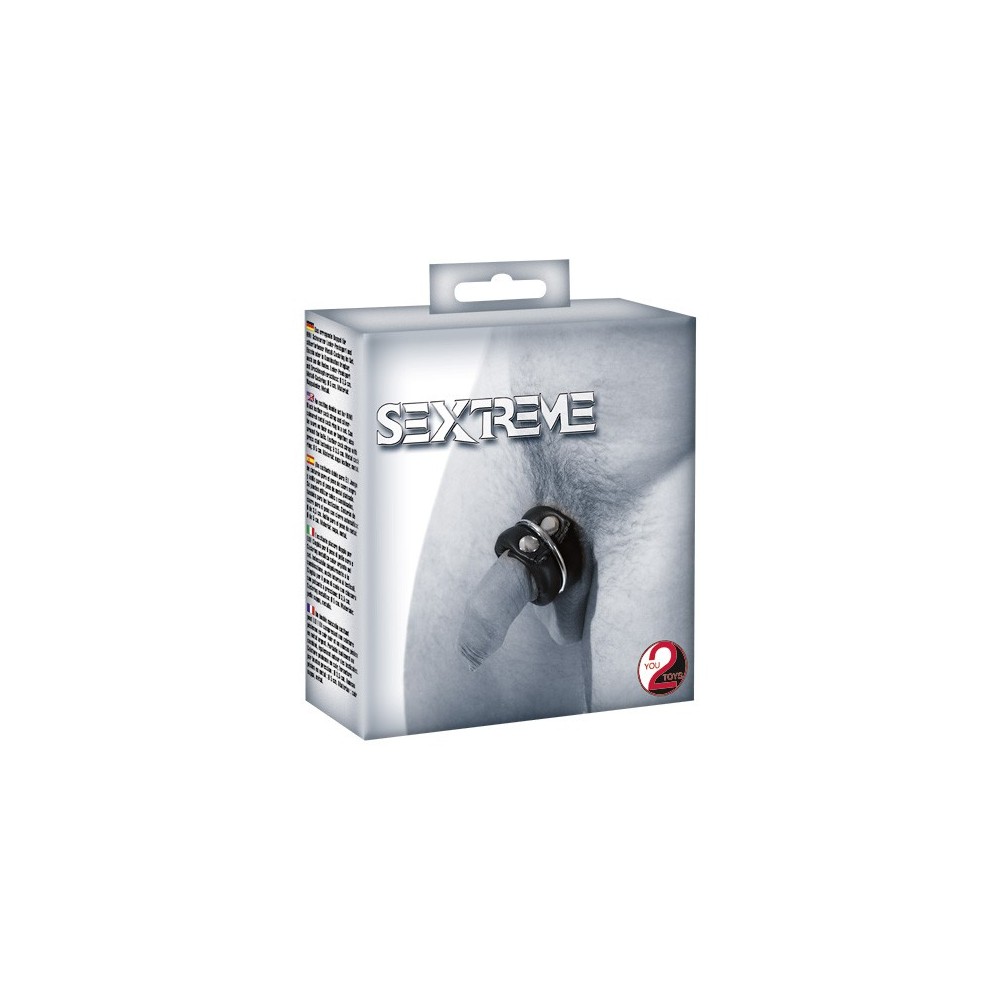 Cintura in pelle nera per il pene con un anello fallico di metallo. Può essere usato insieme o singolarmente, con o senza includere i testicoli.