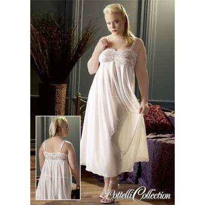 Vestaglia lunga, leggermente svasato con decorazione in pizzo sul décolleté. Trasparenza color crema. Inclusa la stringa con tassello in cotone.