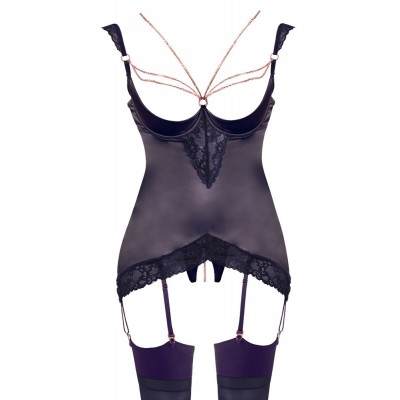 Questa sensuale baschina con reggiseno a mensola ha bretelle regolabili e rimovibili e coppe con ferretto leggermente imbottite. Il basco ha anche una chiusura a gancio sul retro. Con dettagli in pizzo fantasia ed elaborate decorazioni in strass nella zona del décolleté. La decorazione in strass corre su tre catenelle sottili su entrambi i lati. Le catene vanno sopra il seno e arrivano anche fino al collo in uno stile halterneck. Ci sono anche ulteriori inserti in pizzo sul davanti della baschina, sulle spalline e sull'orlo. La stringa corrispondente è senza crotch e aperta in modo invitante. Ha anche una piccola catena che stimola sensualmente ad ogni passo compiuto. Questa catena può essere rimossa grazie al moschettone, proprio come le catene sul basco stesso.