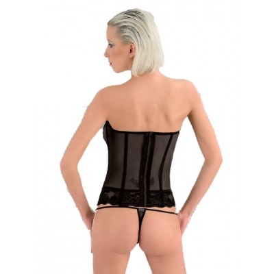 Pregiato coordinato di Eros Veneziani composto da bustino in raso nero semitrasparente, con gioiello centrale. Presenta una splendida lavorazione ricamata sulle coppe del seno e sul bordo. Allacciatura posteriore.