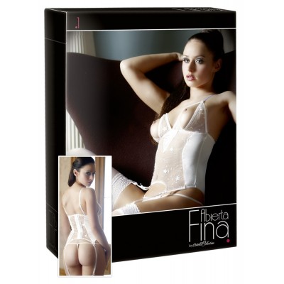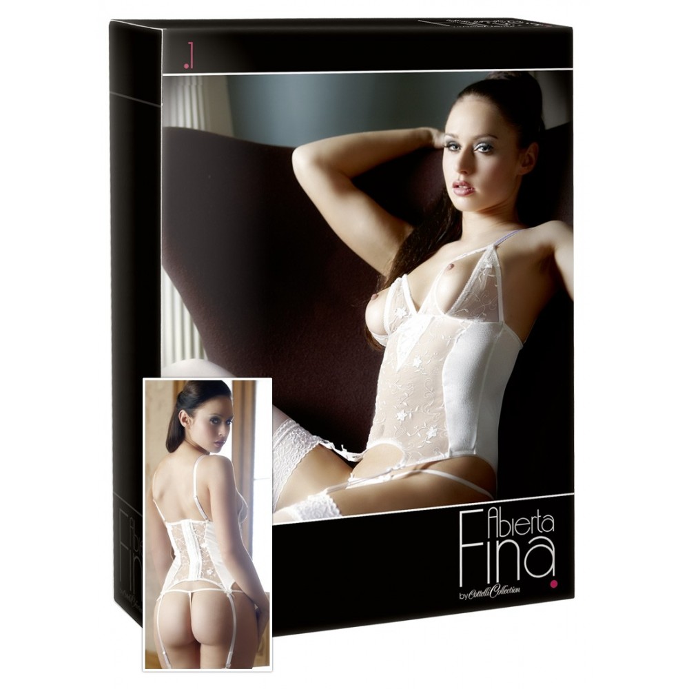 Guepierre bianca by Abierta Fina. Delicato e sexy completo, ricamato in rete fina e raso stretch. Sexy perizoma completamente ricamato, con cavallo aperto, aperture sui seni, chiusura con ganci sulla parte posteriore, spalline e bretelle per calze regolabili.