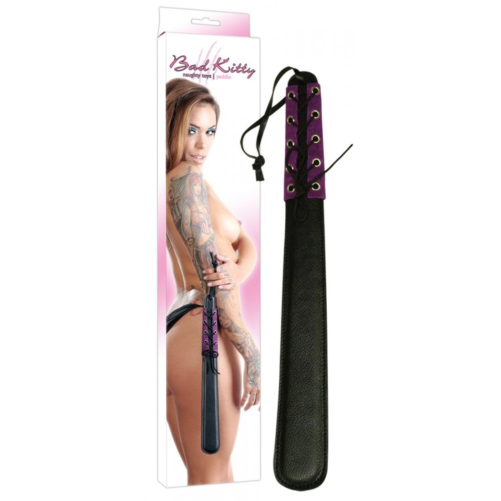 Per trattamenti "d'urto"! Sculacciatore con lavorazione di pregio e un lato leggermente imbottito. Manico con fascetta cordonata in pelle scamosciata colore viola. • Dimensioni: lunghezza 42 cm e larghezza 5 cm; • Materiale: pelle / poliuretano.