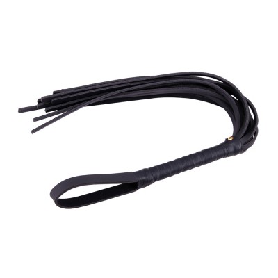 Frusta nera, tipo flogger, con più code dotata di impugnatura a intreccio e gancio per appenderla.