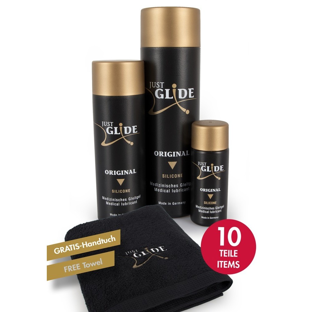 Il lubrificante medico "Just Glide Original Silicone" in tre misure + un asciugamano GRATUITO in un set e ad un ottimo prezzo!