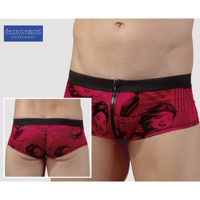 Boxer elastico con stampe varie nere su rosso ed ampia cerniera frontale.