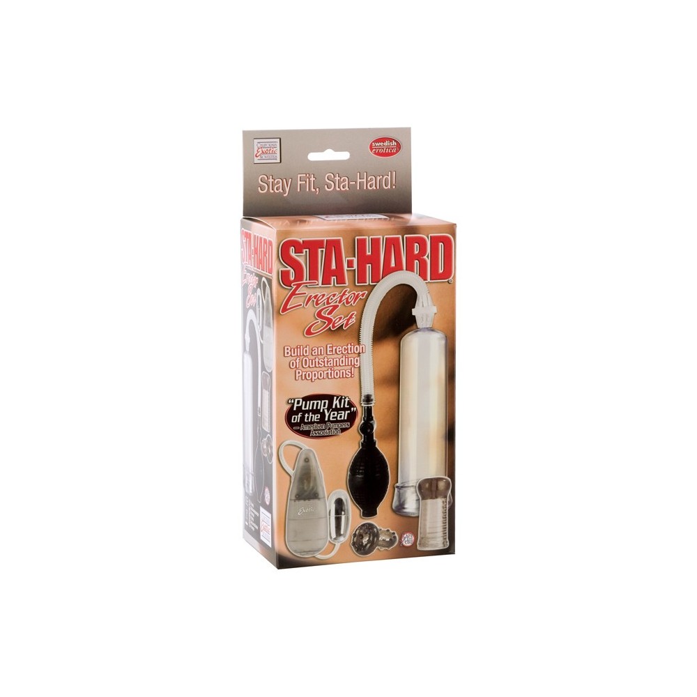 Sviluppatore Sta-Hard Erector Set funzione facendo uscire l'aria dalla camera, il sangue scorre nel vostro membro per un enorme erezione! Morbido, confortevole con ciambella in gelatina alla base costituisce una perfetta tenuta. Comprende All-Star Enhancer Anello morbido che lo tiene duro finche' vuoi. Aggiungi vibrazioni con un ovulo vibrante.