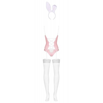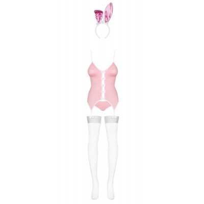 Basco rosa chiaro con bordo bianco. La parte anteriore aperta è chiusa da graziosi fiocchi bianchi. La parte posteriore del basco affascina con l'allacciatura fantasia. Include slip abbinati con una soffice coda bianca e un cerchietto con orecchie da coniglio. Senza calze.